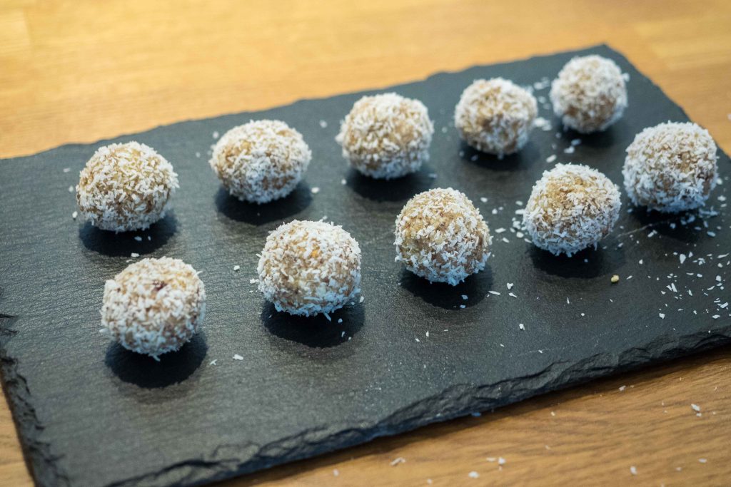 Après avoir réalisé de petites boules avec ses mains, on les roule dans la noix de coco râpée et on les place ensuite 1 heure au réfrigérateur.